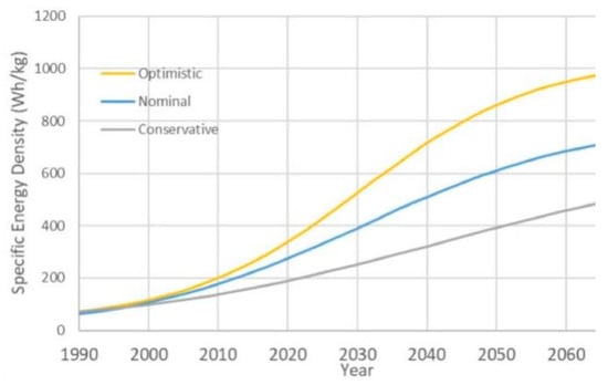 Battery, hydrogen, SAF and hybrid propulsion systems are anticipated to replace traditional propulsion systems. Short-range flight routes offer the greatest potential for transition to electric propulsion, as they typically require minimal modifications to the existing airframe and configuration. Instead of redesigning the entire aircraft, electric systems can often be retrofitted in place of traditional propulsion, making the shift more practical and cost-effective. The energy density of today’s state-of-the-art lithium-ion batteries ranges between 180 and 300 Wh/kg at the pack level. However, a 1330 Wh/kg specific energy battery is needed to achieve a 1000 km+ range for a 150-passenger aircraft [4]. The optimistic projection of the battery specific energy density will reach nearly 1000 Wh/kg by 2050 (Figure 1) [5]. However, a specific energy density of at least 1000 Wh/Kg should be achieved to replace the propulsion of conventional single-aisle aircraft with batteries. This still falls ~25% short of the 1330 Wh/kg required for a 150-passenger, 1000+ single aisle aircraft. Another potential battery technology beyond Li-Ion is the Li-S battery and it is expected to reach an energy density level of 2654 Wh/Kg (theoretical specific energy density). However, this may provide only ~50% cell level efficiency output of the size of 1330 Wh/Kg. Moreover, currently, constraints in battery technology and operational requirements create an unfavorable situation for using batteries in conventional single-aisle aircraft or beyond. Yet, new battery electric aircraft concepts and designs could improve performance [6]. This gap in technology clearly suggests that battery electric propulsion alone is unlikely to be viable for single-aisle aircraft without significantly improving airframe efficiency or hybridization.