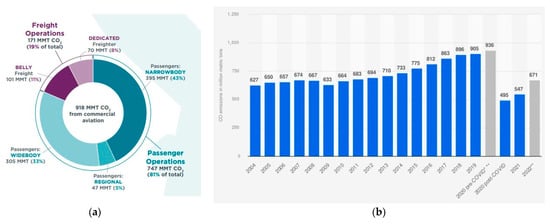 Carbon dioxide emissions from commercial aviation worldwide from 2004 to 2022, Statista, ICCT-2018 (in million metric tons) [2]: (a) CO2 emission contribution; (b) CO emission annually.