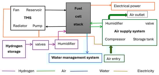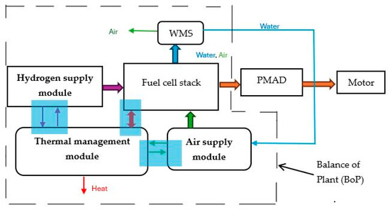 Fuel cells convert fuel and air into electricity, producing only water as a by-product. Fuel cell technology, types, and systems are well characterized in many studies [44,45,46]. The application of fuel cells in aircraft propulsion is reported in the literature accordingly [47]. A fuel cell-based propulsion system is already integrated into road vehicles using compressed hydrogen gas as fuel [48]. However, adopting fuel cell powertrains in aircraft is challenging due to their lower specific power, specific volume, and efficiency. As shown in Figure 5, the fuel cell system consists of several systems and components. A fuel cell stack consists of several cells and it requires other subsystems to operate in an optimum condition.