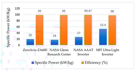 Additionally, researchers at MIT have designed an ultra-light inverter capable of producing 53.4 kW/kg specific power with over 98% efficiency for a 1-MW motor [88]. This inverter comprises ten 100 kW three-phase inverter modules, demonstrating the scalability of modular designs for electrified propulsion. Also, 1-MW integrated modular motor drive is developed at the NASA test facility (NEAT), with a specific power of 9 kW/kg [89]. The specific power density and efficiency of the potential inverters are shown in Figure 10.