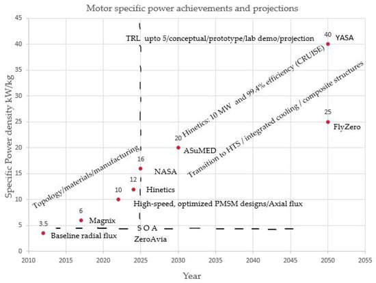 FlyZero’s target for 2030 for the electric motor is 23 kW/kg and 25 kW/kg in 2050, enabling narrow-body aircraft (like A320 and 737) to be capable of flying with 100+ seat aircraft [49]. Figure 11 illustrates the projected specific power trends for electric motors from various studies. Furthermore, advancements in superconducting motors could boost power densities up to 20 kW/kg by 2035, significantly surpassing the current technology benchmark of approximately 5 kW/kg.