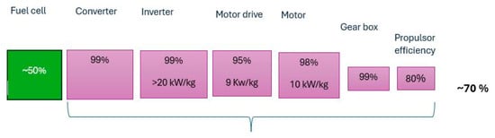 The powertrain’s overall efficiency is around ~35% if the fuel cell is included. Power electronic components and motors have significantly improved the efficiency and specific power. FlyZero’s projections indicate a 75% fuel cell efficiency by 2050, resulting in a ~52% powertrain efficiency.