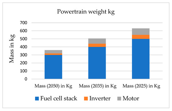 For a 1 MW powertrain, the weight can be estimated using the specific power values of the components in the hydrogen-electric powertrain across different timeframes. The component specific power values are shown in Table 5 for different timeframes.