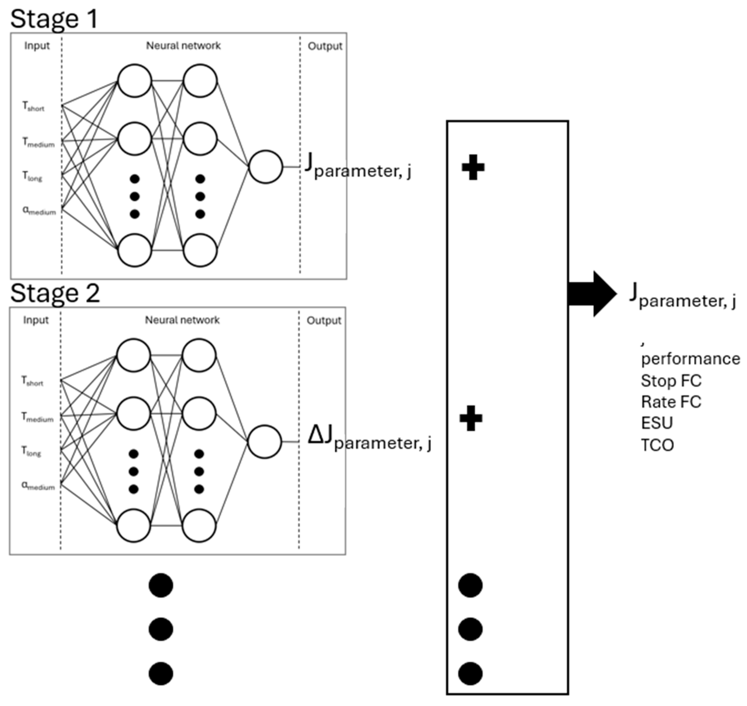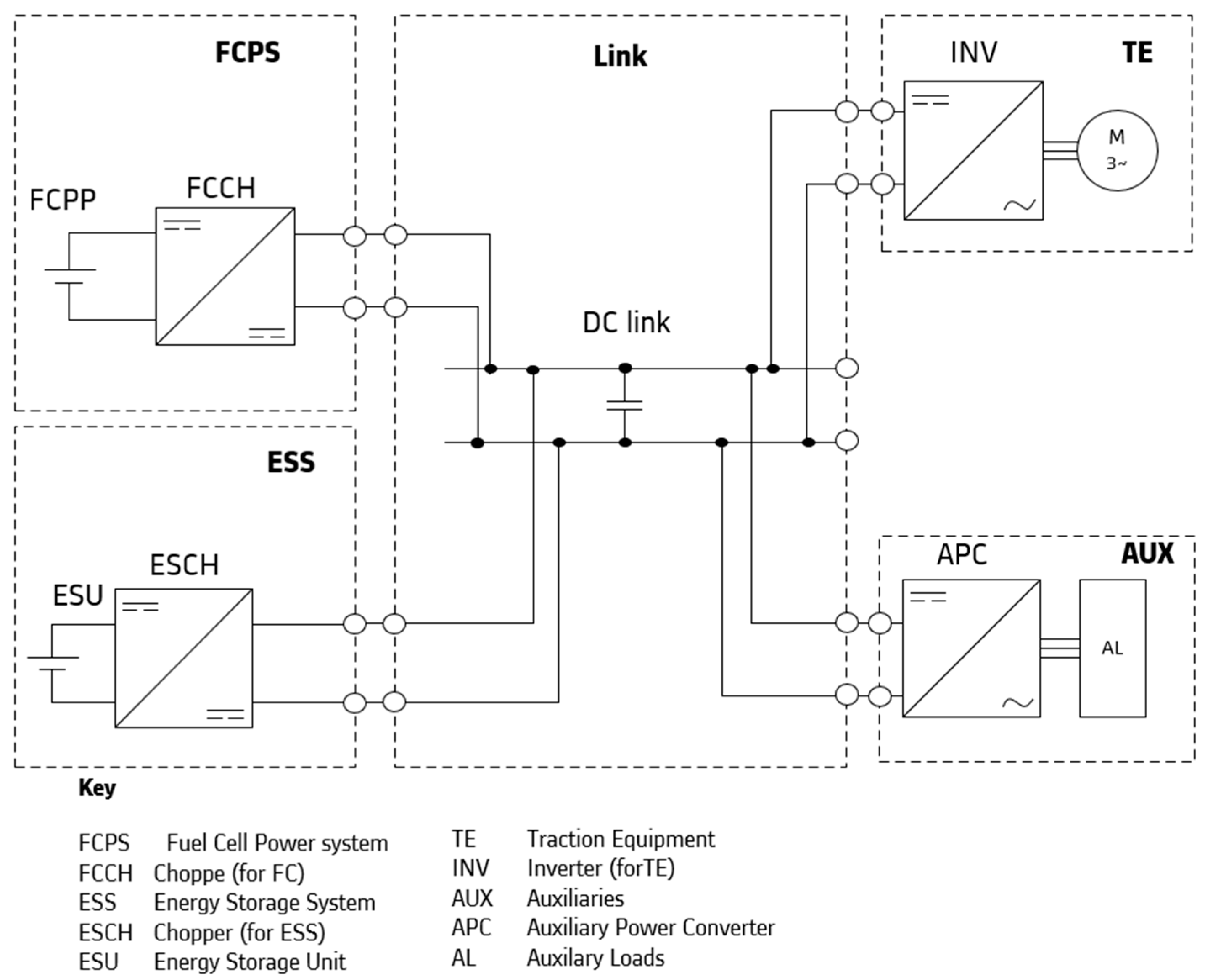 Concerning the SOH of the components, we will age the ESU and the FC together. We will consider two states, as the aging is considered linear over time—the BoL (Beginning of Life) and the EoL (End of Life). For the battery, the aging is simple; the internal resistance is increased up to twice the BOL value at the EOL. The capacity is reduced by 20% at the EOL to reach 80% of the BOL capacity. The FC is more complex; the polar curve is updated and so is the efficiency, but the auxiliary consumption cannot be shared for confidentiality reasons. As the components age linearly, the BOL and EOL will have the same occurrence probability of 50% each.