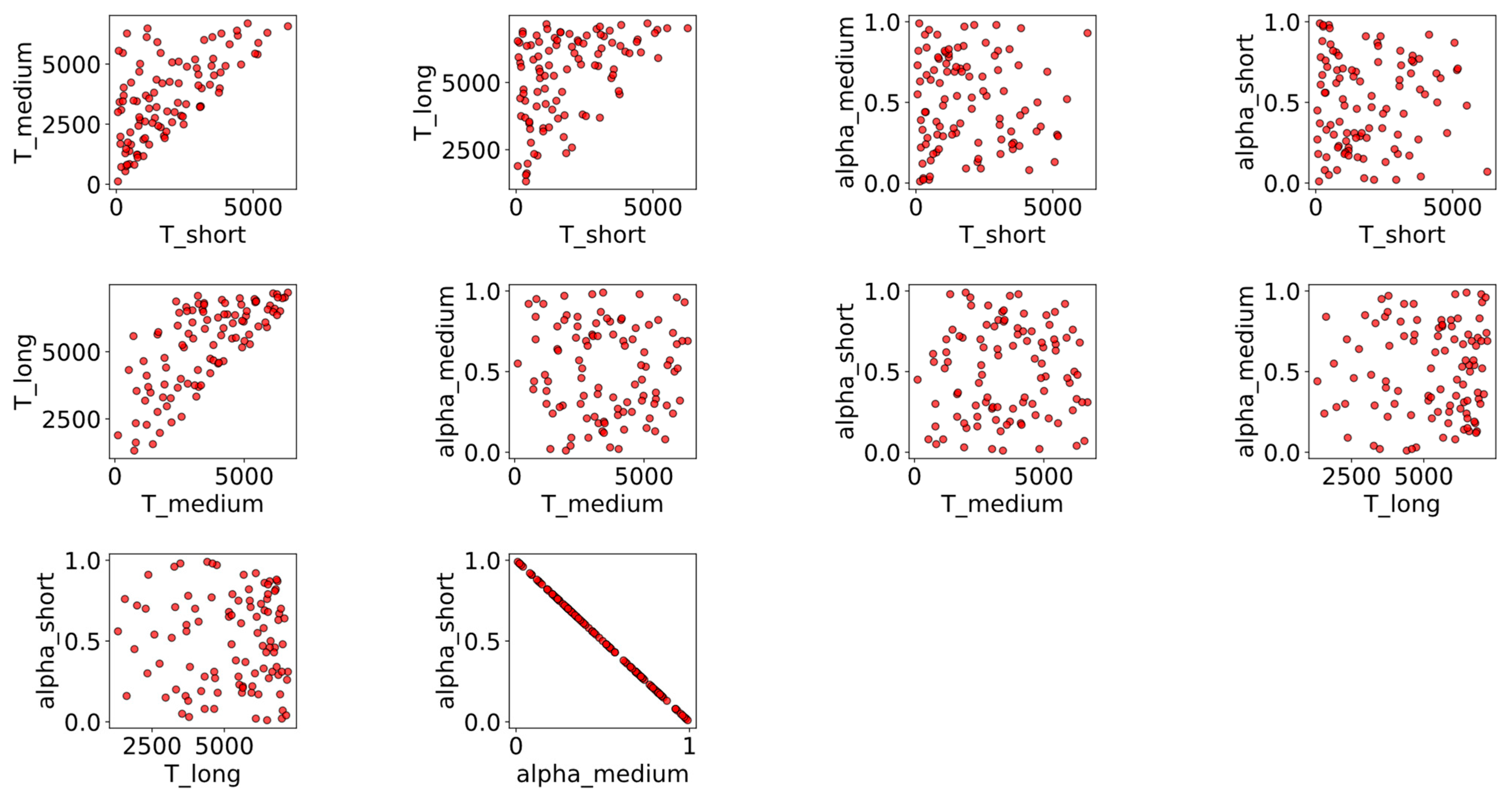 17]. Thanks to the LHS, the number of parameter combinations can be reduced to 100 for the initial phase. This number is sufficient to begin training the ML model. The representation of the selected combinations is given on