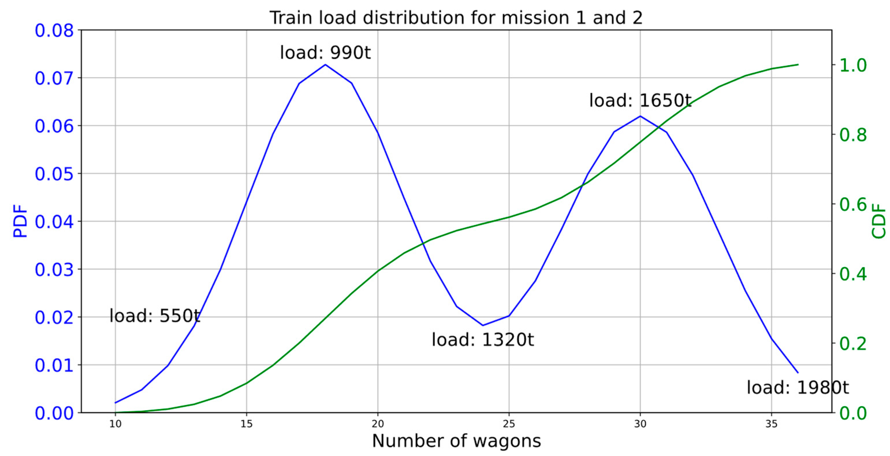 The shunting missions operate from 10 wagons up to 36 wagons. From the data of a customer, it appears that the most likely situations are around 1000 t (≈18 wagons) and between 1800 tons and 2000 tons (≈33 wagons). To represent the bimodal law, we have added two normal laws centered around 18 wagons and 30 wagons. The second peak for 30 wagons was a bit shifted to include a high density at 33 wagons, but a wider impact. This bimodal law is finally truncated between 10 wagons and 36 wagons. The bimodal probability density law is given by Equations (12)–(16) below.