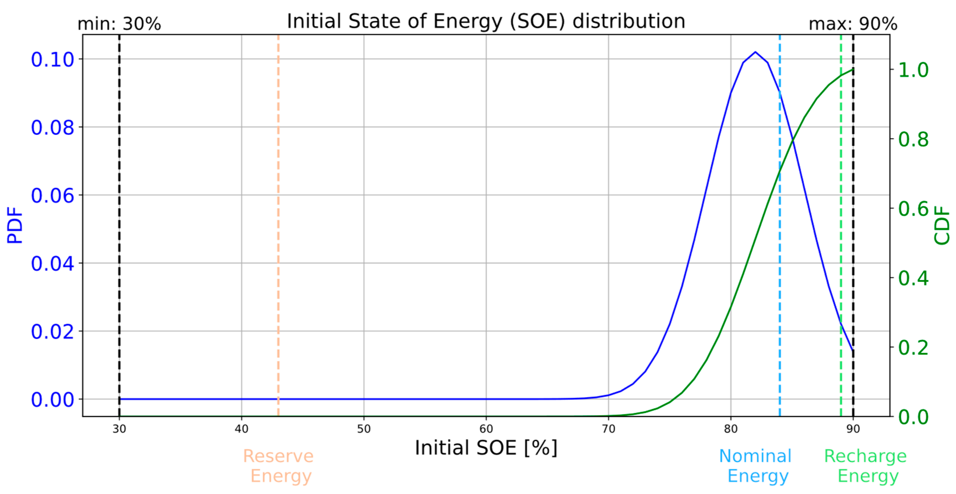 The last two factors in the scenario are related to the initialization of the simulation. These factors account for the fact that, prior to the current mission, any number of situations could have occurred. The first factor is the initial state of energy at the beginning of the mission. Although the EPMS is designed to regulate the state of energy close to the nominal value (84%), modeling a normal distribution centered at 84% would result in a probability that is too high, of nearly 90%, which is the maximum allowed energy. Moreover, the likelihood of ending a mission with an undercharged battery is higher than of ending it with an overcharged one. Therefore, the mean value was set at 82%. A standard deviation of 5% was chosen to reflect the variability in the final charge level after each mission. Finally, the normal distribution is truncated to remain within the operational range of the battery, which is between 30% and 90%. The corresponding probability density function is shown in