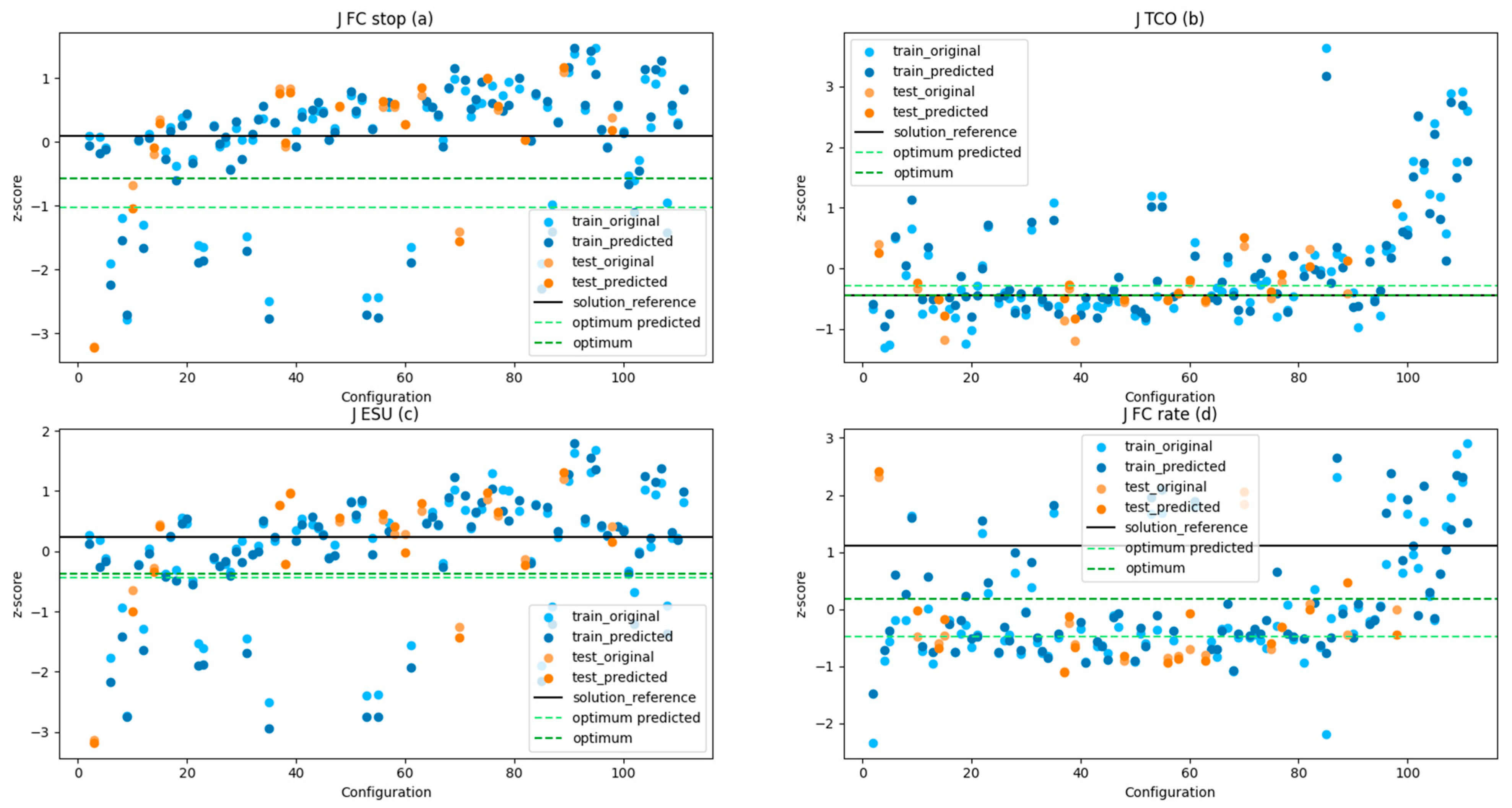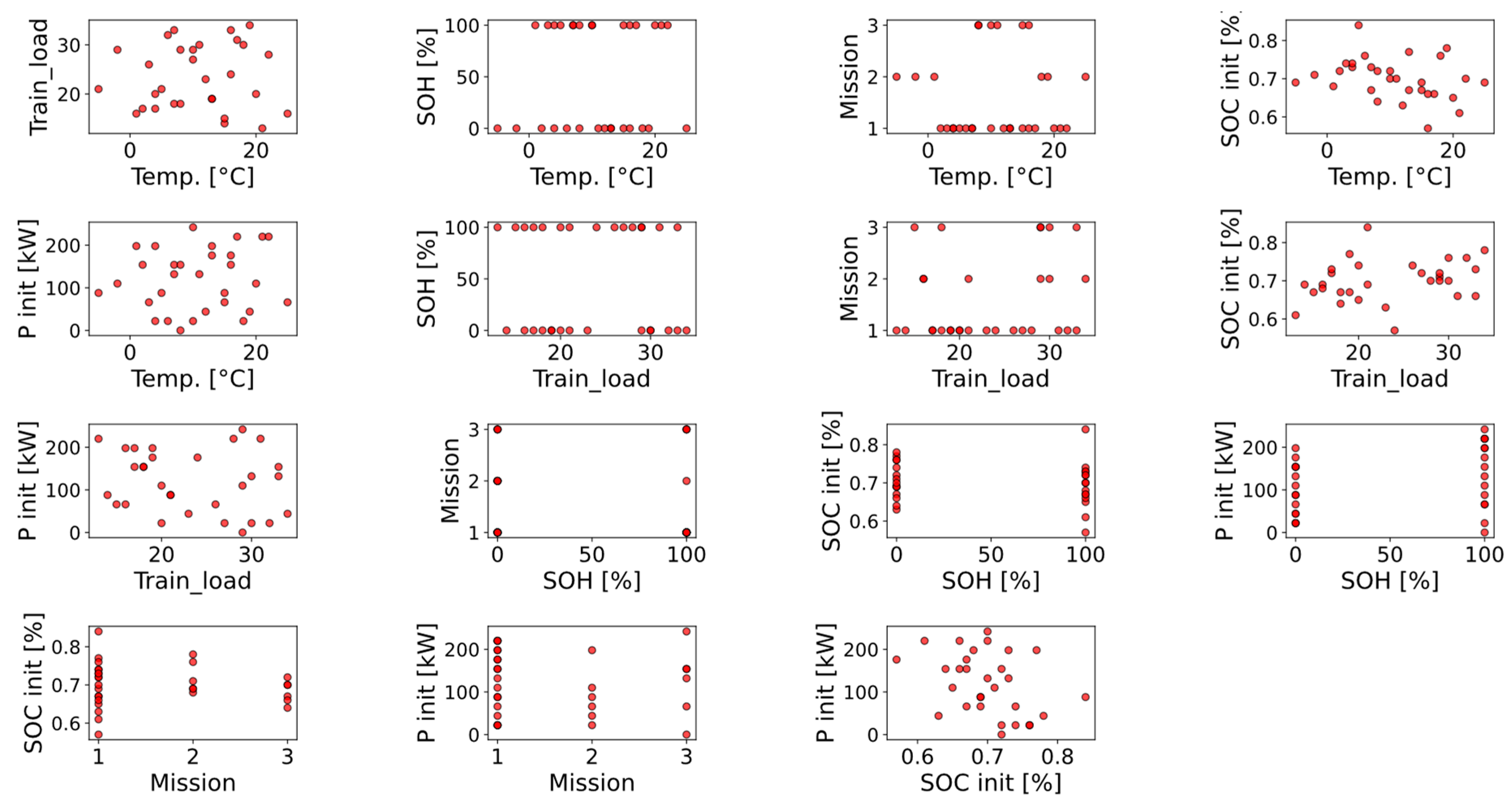 Figure 11, the first subgraph (row 1, column 1) shows the train load and temperature across 30 scenarios. Despite the limited number of data points, we can observe a good distribution across both scenario conditions. In the 13th subgraph (row 4, column 1), the scenario conditions are illustrated across three missions with their corresponding initial state of charge (SOC). Since the first mission is more likely to occur, we ensure the broader coverage of initial SOC values for this mission. In contrast, missions 2 and 3 focus more specifically on the most probable initial SOC values.