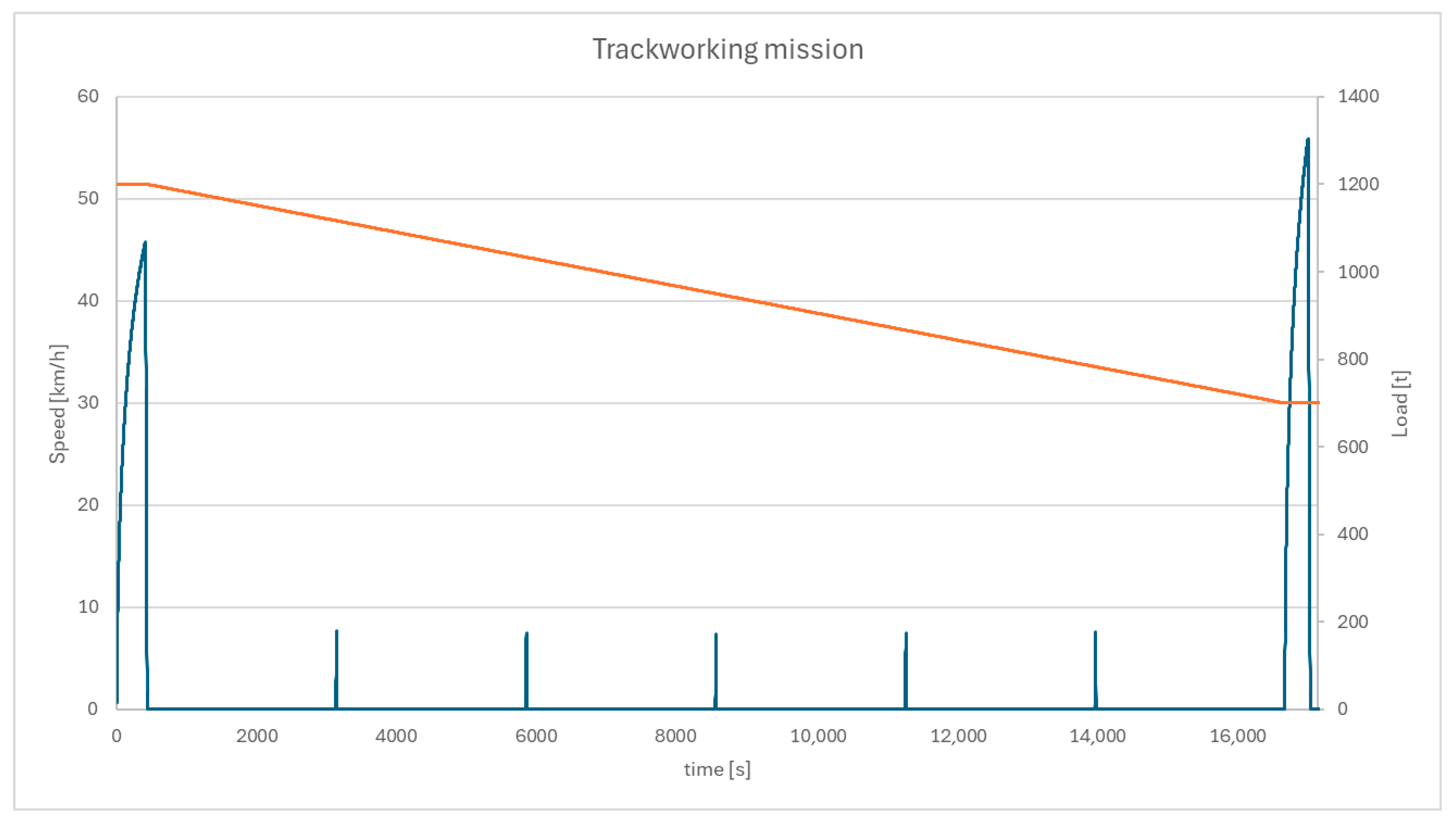 In this mission, the locomotive retrieves wagons of varying loads. The train runs empty in one direction and fully loaded in the other, with the load ranging from 500 to 2000 tons. This round trip is repeated 10 times consecutively;