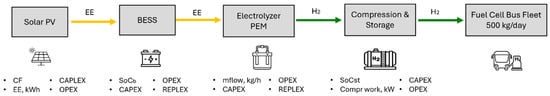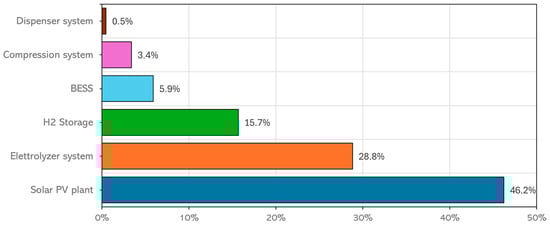 In the case study—aimed at minimizing fuel costs for a bus fleet refueled with on-site green hydrogen produced via PV-powered electrolysis—the is 11 €/kg, which remains well above the diesel-parity—energy-equivalence—price. Because roughly 70% of total CAPEX is attributable to the PV plant and the electrolyzer, as shown in Figure 8, it is pertinent to quantify the minimum incentive intensity that would render the project investable while allowing hydrogen to be delivered to the fleet at the parity price.