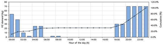 Daily hydrogen demand profile for a bus fleet, developed on the basis of the distribution reported in [40].