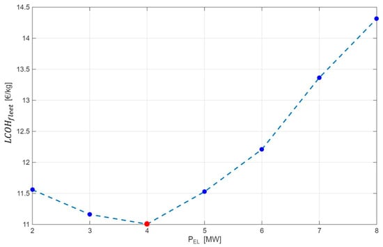 Figure 4 reports the minimum values obtained for electrolyzer capacities ranging from 2 MW to 8 MW, assuming that the demand is exclusively determined by the hydrogen requirements of a bus fleet. The optimal configuration, highlighted in red, corresponds to a 4 MW electrolyzer and yields a minimum of about 11 €/kg. This result reflects the configuration that maximizes economic efficiency under the specified demand, local operating conditions, and assumed economic parameters. Smaller electrolyzer sizes lead to undersized production systems, which necessitate a significant increase in storage capacity to meet operational constraints, thereby raising costs. Conversely, larger electrolyzer capacities result in oversizing relative to demand, again increasing costs and moving away from the economic optimum. In both cases, deviations from the optimal configuration drive upward, underlining the importance of a balanced system design tailored to demand and local resource availability.