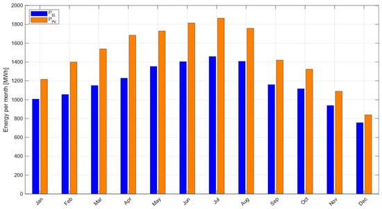 PV production: The photovoltaic output (kW) was estimated based on the capacity factor, defined as the ratio between the actual PV energy produced at time t and the maximum theoretical energy that could be generated over the same time interval, as expressed in Equation (10). Multiplying the capacity factor by the nominal PV power simulated for the plant yields the average hourly electricity output of the system: