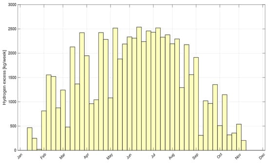 Weekly hydrogen excess with respect to the fuel cell bus fleet demand.