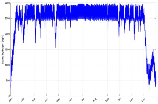 Hourly stored-hydrogen profile over the study year, highlighting seasonal behavior.