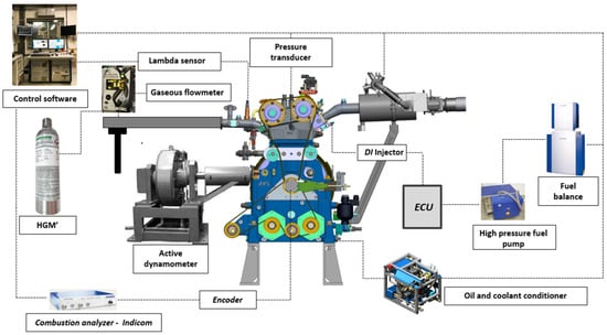 An AVL 5405 single-cylinder naturally aspirated, four-stroke, with a displacement of 0.45 L, equipped with a fuel direct injection system, spark-ignited engine was used to conduct the experimental tests. Figure 1 displays the schematic of the engine test room and the associated systems for controlling.