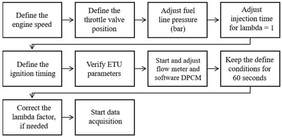 The flowchart presented in Figure 3 illustrates the standard calibration procedure used for direct injection (DI) systems. The dwell time map of the ignition system is determined for the engine operating in motoring at 1000 rpm until 6000 rpm (step 1000 rpm) and 0.30 bar until 0.90 bar (step 0.30 bar) of intake manifold pressure. A current probe connected to the IndiCom measures the current in the coil primary, determining the dwell time required to reach coil charging saturation (2.7 ms by default for the coil used).