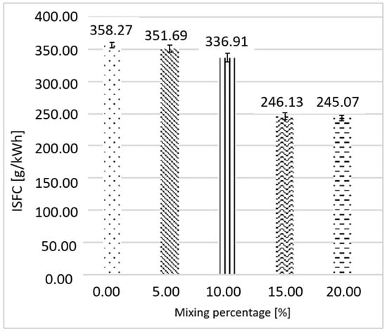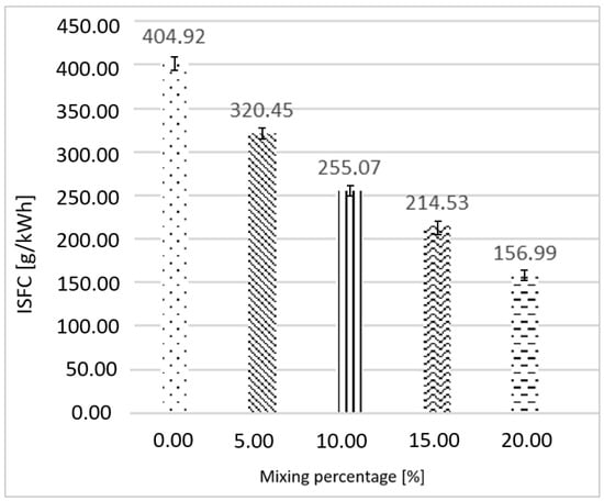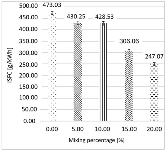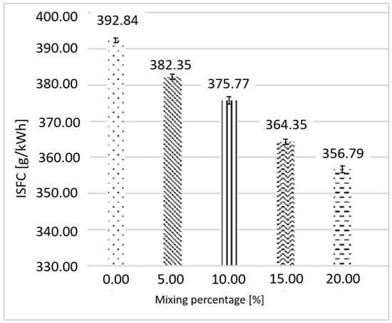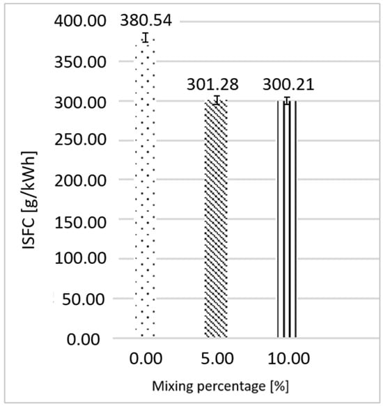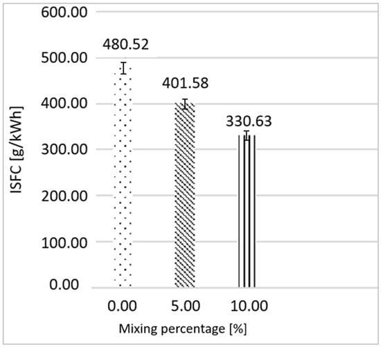 Regarding the ISFC, the results in Figure 4, Figure 5 and Figure 6 showed a decrease in this parameter as the mixture flow rate increases, with emphasis on the substitution of 5% of the mixture, which shows a significant decrease on the indicated specific fuel consumption, proving that there is no need for high flow rates of HGM’ to reach positive results, as observed by Ren et al. []. The ISFC decrease continues as the flow rate increases in all tested conditions.