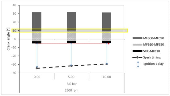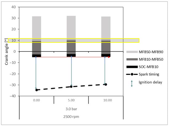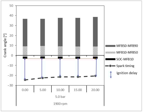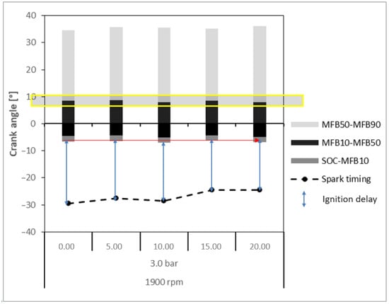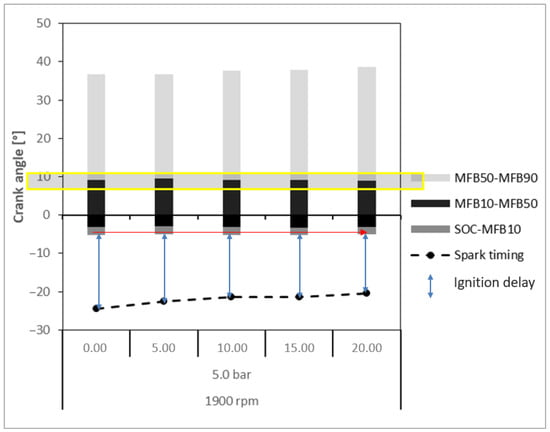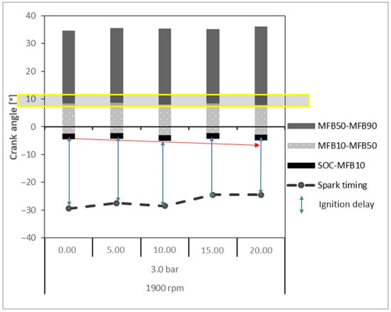For this reason, it is necessary to decrease the spark timing ignition to achieve optimal combustion phasing, as MFB50 cannot be positioned around 8 °CA. Ayala et al. [] recommend centralizing the combustion process (MFB50) at 8 °CA to allow for greater energy conversion into useful work, and consequently, higher efficiency in fuel conversion.