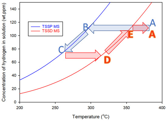 Standard TSS curves for Zr-2.5Nb containing hydrogen, determined from the maximum slope (MS) temperatures of the exothermic and endothermic DSC heat flows that define TSSP and TSSD, respectively ([4] Equations (D.2-2) and (D.2-1)). An example of a conventional precipitation–dissolution cycle is shown by the arrows. Cooling from Point A, the concentration of hydrogen in the solution does not change as the TSSD curve is crossed, staying constant until Point B. With further cooling, the concentration follows the TSSP curve until Point C. Heating does not change the concentration until Point D and with further heating, the concentration follows the TSSD curve until Point E, where all the hydrogen is back in the solution. The apparent hysteresis is approximately 60 °C, and the ratio of the TSSP and TSSD concentrations is about 1.9 at 300 °C.