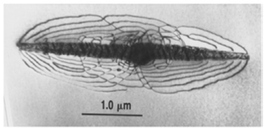 A transmission electron micrograph of a γ-hydride in zirconium, surrounded by dislocations [Reprinted/adapted with permission fromS.A. Aldridge].