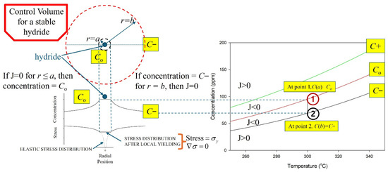The control volume explicitly includes two concentrations that are associated with J = 0. The first concentration is Co, which is associated with the solvus; this is the no gradients in stress or concentration solution. The second concentration is C−. This concentration is associated with the control volume of a stable hydride; it is found at the extent of the control volume and is also associated with no flux when the terms with gradients in stress and concentration cancel. These concentrations are linked by the vertical line between C− and Co at 300 °C in Figure 5. For example, Co is the concentration for r ≤ a, and C− at r = b in the stable hydride control volume. The two concentrations are allowed by Gibbs’ phase rule, Equation (2), for the stable hydride because there are two stress states. For r ≤ a, the stress is truncated at the yield strength. For r = b, the stress equals the hydrostatic stress in the unstressed bulk.