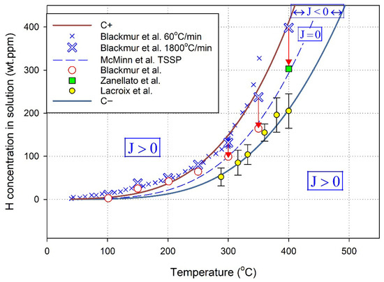 If the turn-around time from cooling to heating is ‘fast’, then at the lowest temperature of cooling, there will be no time for C(b) to fall to C−. When heating starts, there will be a pause before hydrides dissolve, because initially, C(b) will be in the region where J < 0, i.e., within the space between the three curves, see Figure 5. As the temperature increases, the concentration in the solution at the end of cooling will stay at that value until the concentration intersects with the C− curve at a higher temperature, i.e., the concentration will move horizontally with the temperature across the C-T plot to C−. Beyond the temperature of C−, there is a positive flux of hydrogen away from the hydrides, i.e., J > 0, and hydrides dissolve. If the turn-around time takes hours, then C(b) at the lowest cooling temperature will have time to fall to C−. In this case, there will be no pause before hydrides dissolve with heating.