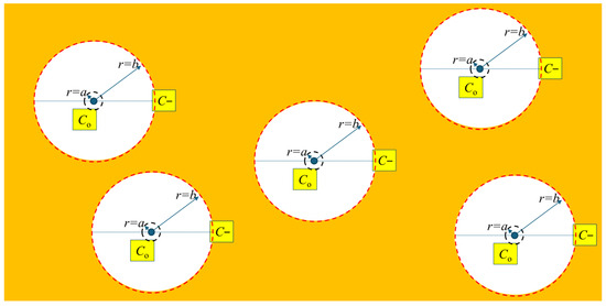 Cylindrical coordinates shown in the upper left corner of Figure 5 are consistent with the geometry of the hydrides formed in the bulk; these concentric circles define the control volume of a hydride. A hydride is idealized as a circle in the figure. Hydrides first form as long needles of γ-phase [12]. In the figure, the hydride extends into the plane of the diagram. The integration limits a and b in Equation (8) are relative to the hydride: a is the distance from the tip of the hydride, defining a region where the stress is truncated at the combined yield strength of the hydride and metal lattice, and b is where the stress has decreased from the value at distance a (i.e., the combined yield strength) to the background value where the stress gradient vanishes. b defines the extent of the control volume associated with a stable hydride. For a hydride to be stable J = 0, there is no net flux of hydrogen in the solution. For a stable hydride, the concentration of hydrogen in the solution will be at the solvus, Co, in the small region adjacent to the hydride surface, i.e., at r ≤ a, and at C− at the periphery of the control volume, i.e., at r = b, so that J = 0.