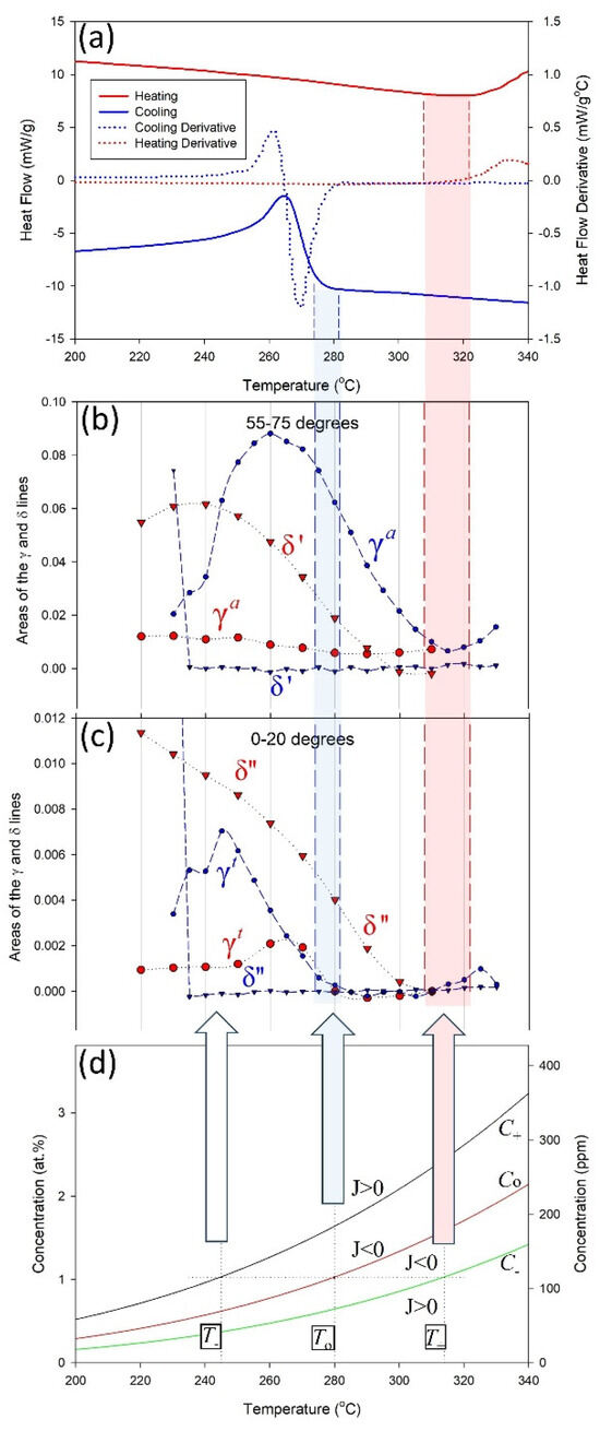 (a) DSC heat flow curves and (b,c) areas of hydride diffraction peaks, obtained during cooling and heating within two angular regions around the diffraction ring [1]. The bottom plot (d) shows how the concentrations of hydrogen in the solution changes with temperature according to the control volume interpretation. Hydride diffraction peaks are seen to start cooling at 315 °C in (b) but no thermal signal is seen until ≈280 °C with DSC in (a). This difference is attributed to athermal hydrides that do not give a measurable DSC signal when they precipitate.