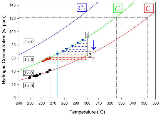 A series of ‘cyclic’ experiments used to monitor C(b) in Zr-2.5Nb as a function of time for specimens that were cooled or heated to the isothermal temperature, 300 °C, where they were held for times up to 60,000 min and then cooled and onset-precipitation temperatures were recorded: blue down-pointing triangles for specimens were initially cooled, and red up-pointing triangles for specimens were initially heated to the isothermal temperature. The arrows show the time sequence of the measurements. The black circular markers from [17] show the DSC endothermic ‘peak’ temperatures for the measured total hydrogen concentrations in Zr-2.5Nb. Point 1 corresponds to the concentration state reached after cooling to 300 °C (C(b) → C0), and Point 2 to that reached after heating (C(b) → C−), illustrating solubility hysteresis at the isothermal temperature.