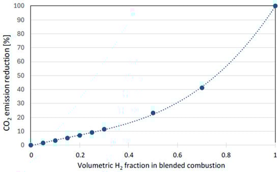 Potential emission reduction as a function of hydrogen volumetric fraction in the fuel. (Reprinted with permission from [3]).