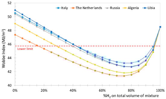 Wobbe Index variation in NG-H2 blends for different NG origins (reprinted with permission from [3]).