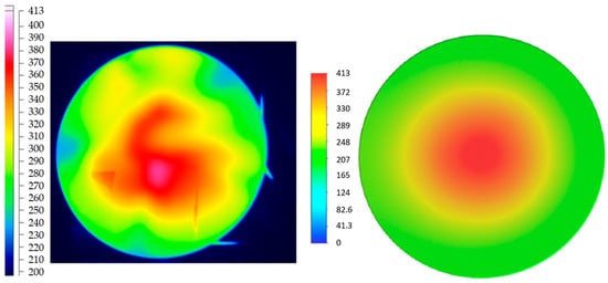 Temperature (°C) distribution from experimental results (left) and CFD results (right) obtained by Liu (reprinted with permission from [10]).