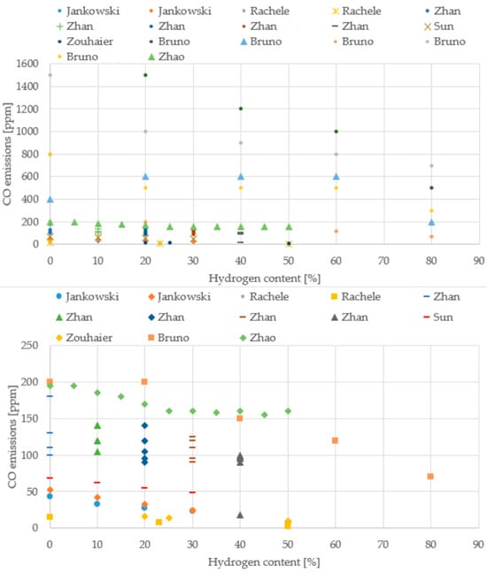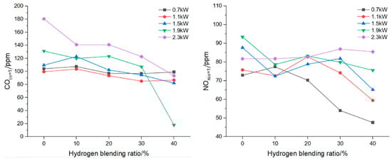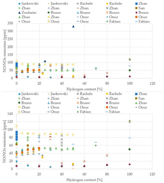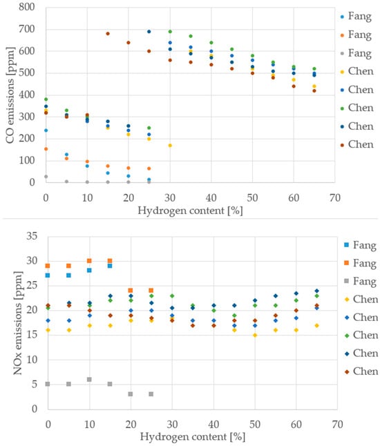 CO and NO emissions in flue gases for different H2 content (reprinted with permission from [39]).