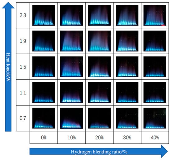 Flame geometry for different thermal loads and hydrogen concentrations in a boiler (reprinted with permission from [22]).