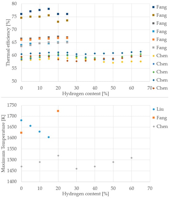 The study by Nosek et al. [50] focused on the numerical analysis of hydrogen-enriched natural gas mixtures (up to 45%) using a mathematical model. The results confirmed that the mixtures remain compatible for use (Wobbe Index preserved) but revealed an inverse correlation: at a constant volumetric flow rate, increasing H2 concentration leads to a significant reduction in thermal power output (by 44.9% at 45% H2), requiring fuel-flow adjustments to maintain performance. Environmentally, a 25% reduction in CO2 emissions was confirmed for a mixture containing 25% H2.