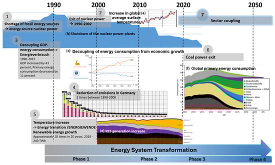 Generation by renewable energy plants, transport and distribution via the power grids, flexible loads, and storage (stationary and mobile) play a decisive role in the supply of the electrical energy of the future and will continue to be expanded [2,3,4]. On the other hand, other sustainable and necessary forms of energy use, such as green heat for households or green gases for industry, are not being developed and integrated into the system in a way that is comparable to renewable electricity generation. In 2024, the shares of renewable energies in the electricity sector in Germany were 54.4%, 18.1% in the heating sector, and 7.2% in the transport sector [5]. This development can certainly be explained by the initial focus on the electricity sector in the 2000s, as well as through the Renewable Energy Sources Act (EEG). Nevertheless, profound energy transformation is also necessary in the household and commercial sectors (especially heating) as well as in industry, including energy-intensive industries such as chemicals and steel (especially as a substitute for gas supplies) [6]. In the future, this will be possible through so-called sector coupling—Phase 3 Measure 7 on Figure 1 of the overall energy transformation from around 2020, which basically produces sustainable, further usable forms of energy such as hydrogen from green electricity through various processes.