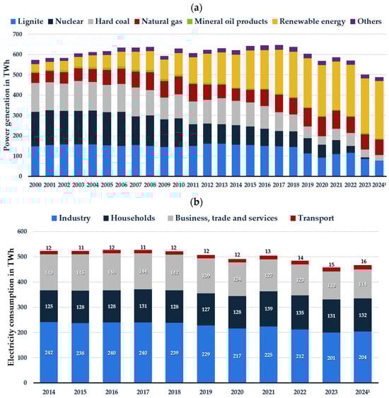 (a) Gross electricity generation by energy source 2000–2024 in TWh [20] and (b) electricity consumption by consumer group 2014–2024 in TWh in Germany [21]. 1 preliminary.