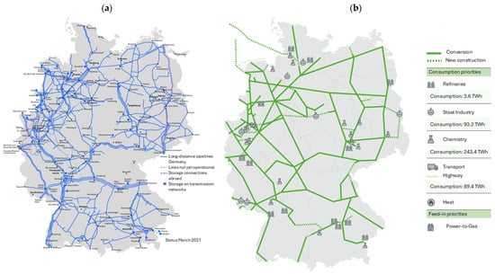 (a) Overview of the German gas transmission network and (b) the future hydrogen network in 2050 [1]. Reproduced with permission from Przemyslaw Komarnicki, Zbigniew Antoni Styczynski, Michael Kranhold, General Energy System (GES) of the Future, Sector Coupling through Electricity and Hydrogen; published by Springer Fachmedien Wiesbaden, 2024.