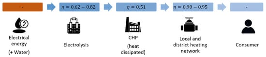 Electrolyzer–CHP system representation using efficiency chain [8]. Reproduced with permission from Przemyslaw Komarnicki, Zbigniew Antoni Styczynski, Michael Kranhold, Sector Coupling—Energy-Sustainable Economy of the Future, Fundamentals, Model and Planning Example of a General Energy System (GES); published by Springer Fachmedien Wiesbaden, 2023.