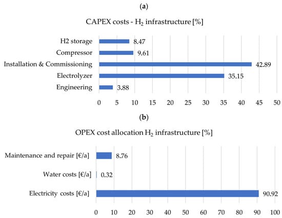 Cost allocation (CAPEX (a), OPEX (b)) for typical hydrogen infrastructure.