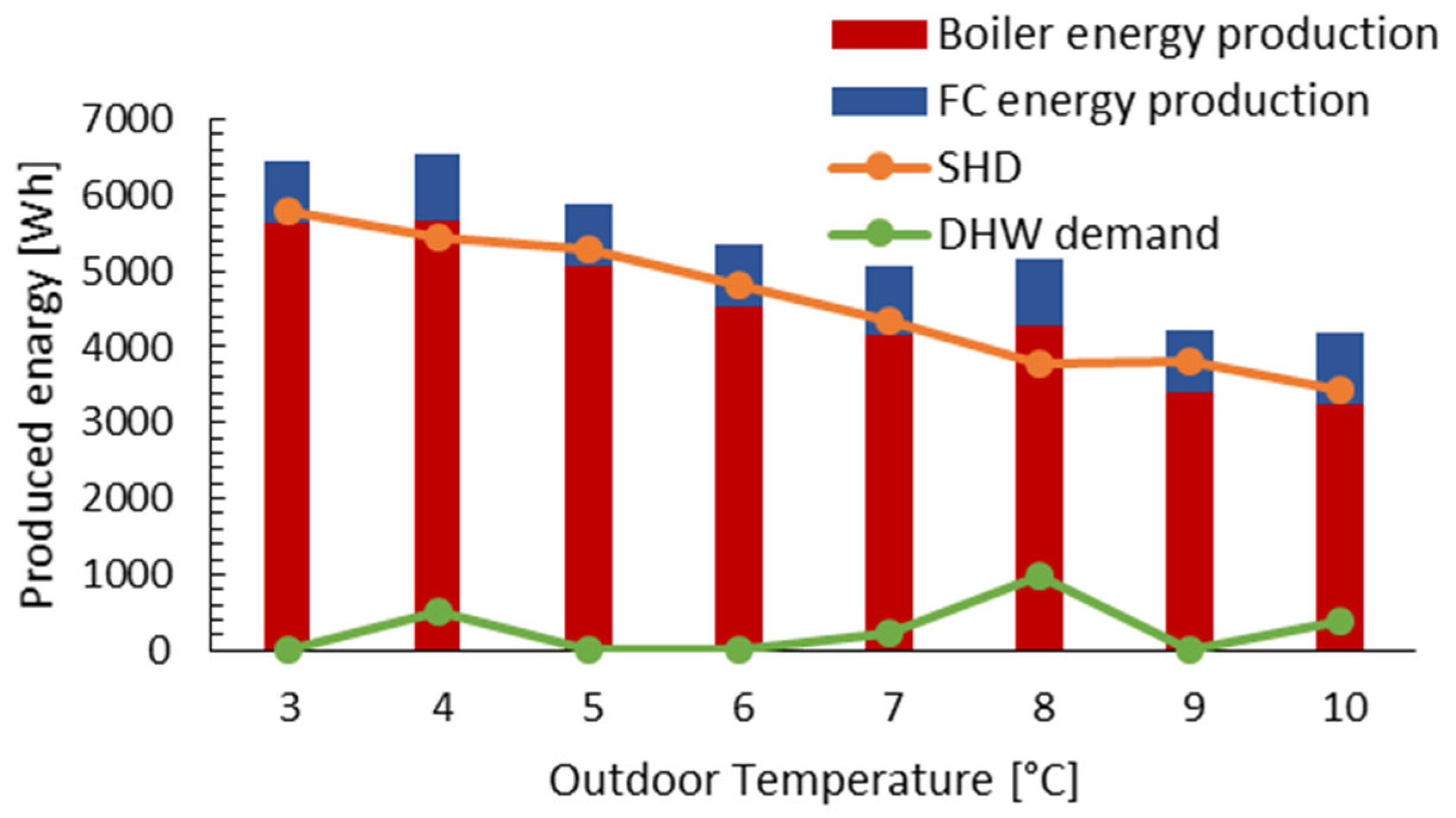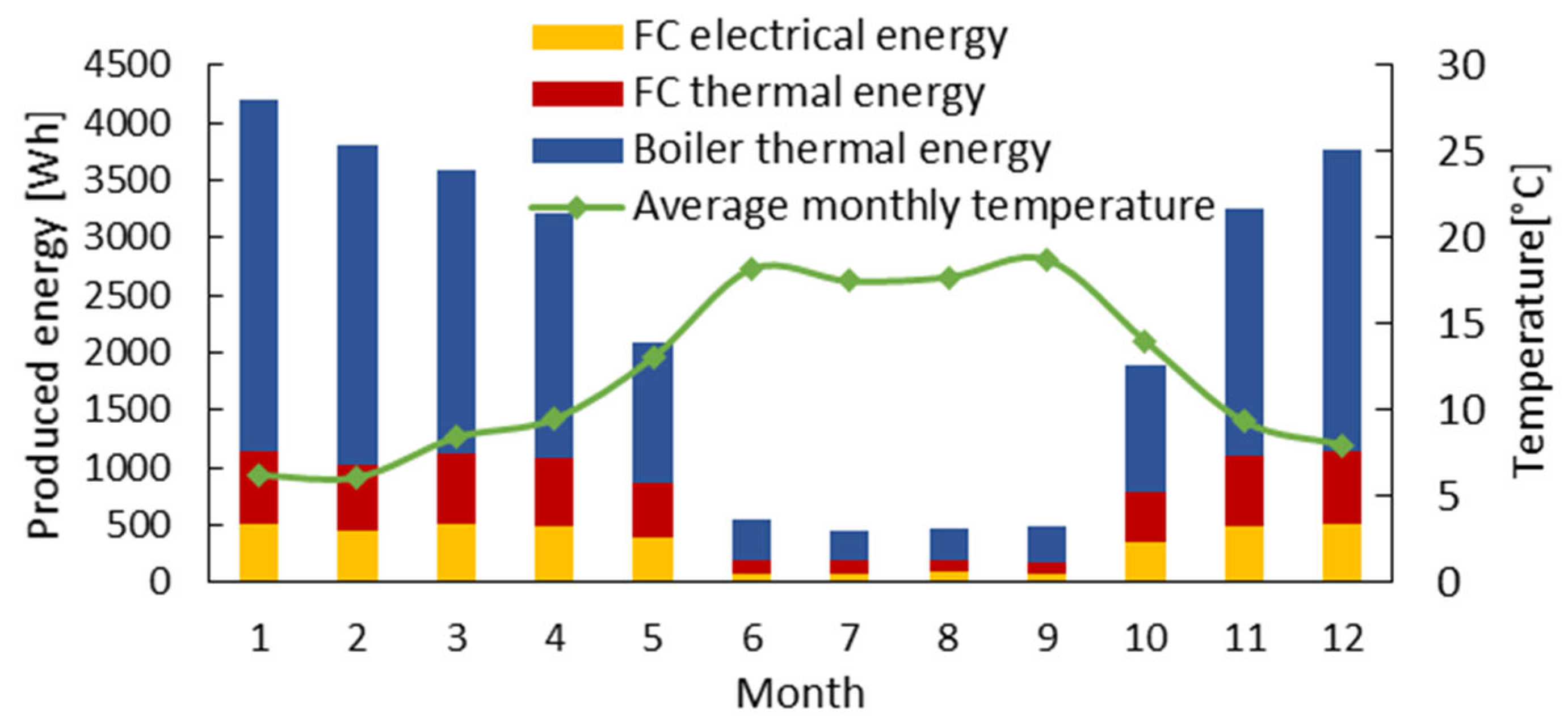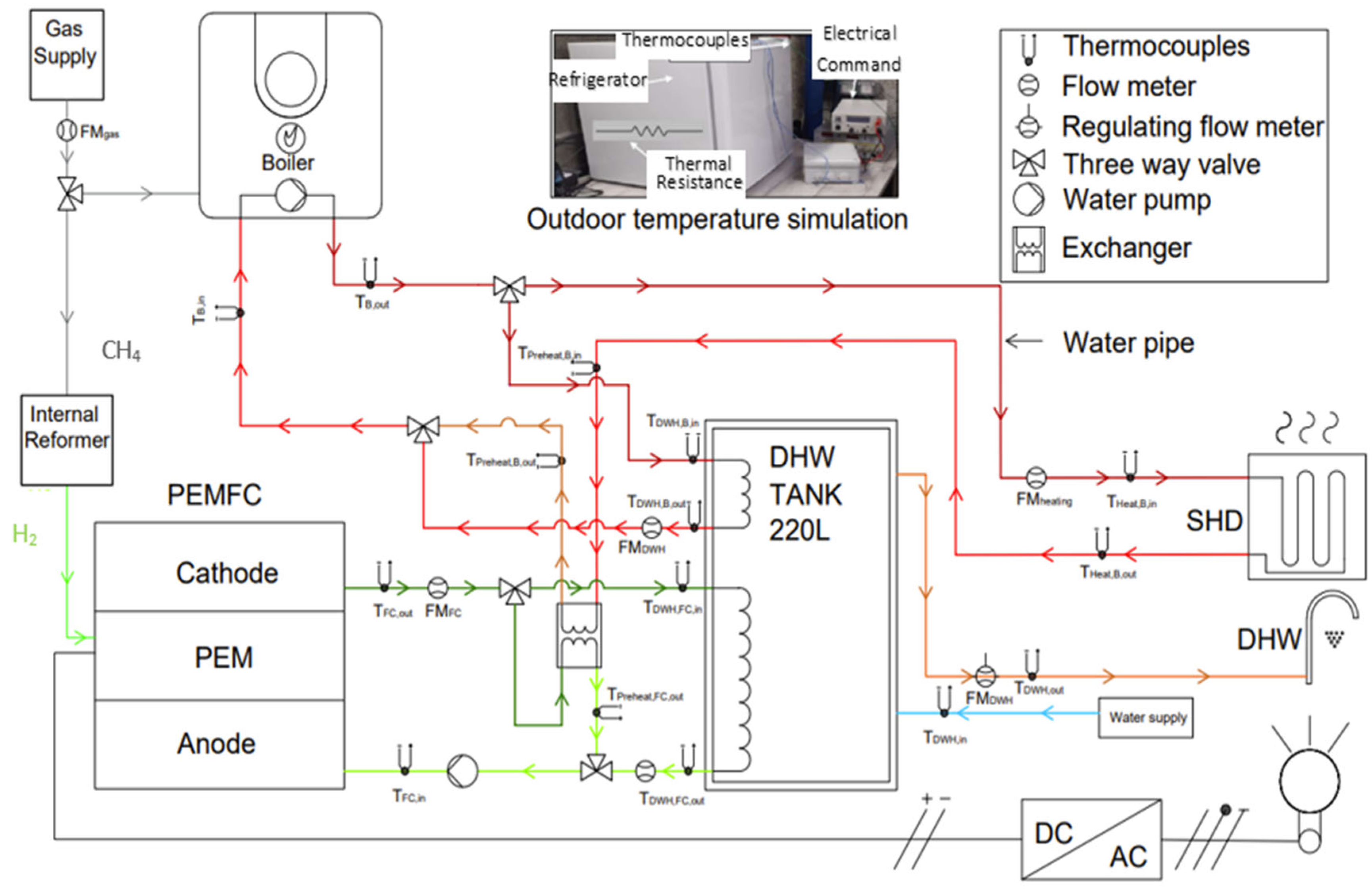 - Elkhatib, R.; Petrone, R.; Louahlia, H. Dynamic Study of Hydrogen Optimization in the Hybrid Boiler-Fuel Cells MCHP Unit for Eco-Friendly House. Int. J. Hydrogen Energy 2024, 56, 973–988. [Google Scholar] [CrossRef]