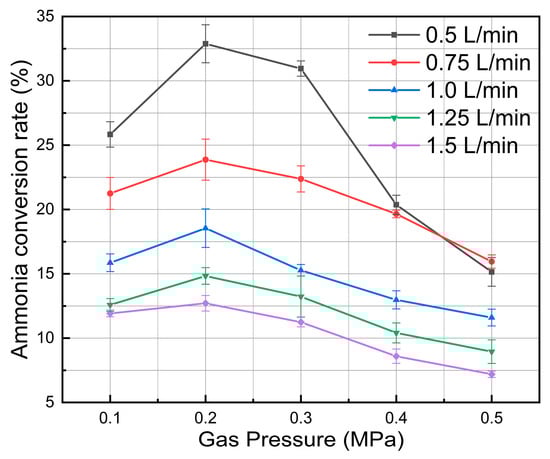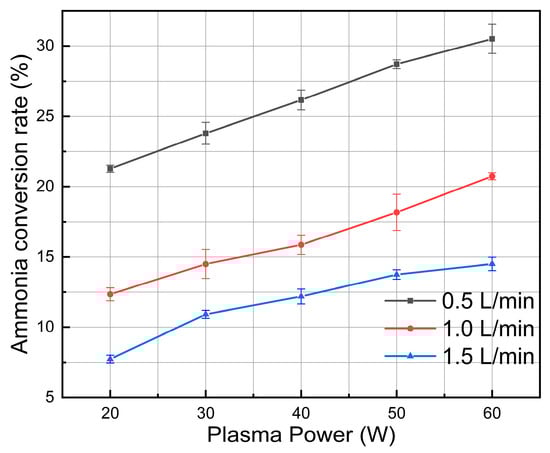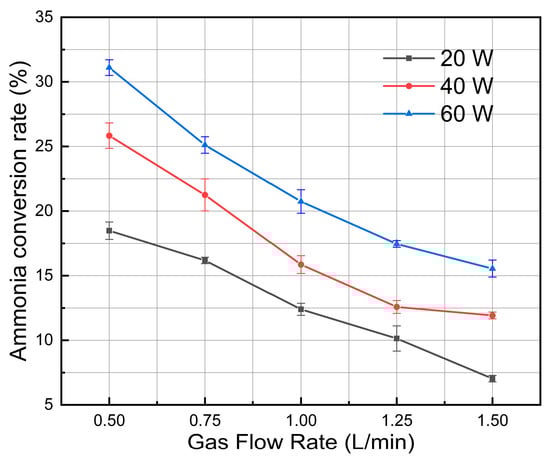 The experiment examined the impact of NH3 gas flow rate on the ammonia conversion rate. Reaction parameters include a discharge pulsed frequency of 20 Hz and a plasma reaction duration of 20 min. Experiments were conducted under various gas flow rates adjusted to 0.5 L/min, 0.75 L/min, 1 L/min, 1.25 L/min, and 1.5 L/min.