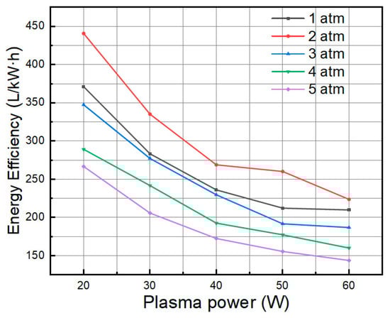 Figure 8 shows the energy efficiency of ammonia cracking under varying pressure conditions. Upon increasing the input power from 20 W to 60 W in the sliding arc plasma-assisted ammonia cracking experiment conducted at 2 atm, a notable decline in the ammonia cracking energy efficiency was observed, dropping from 440.7 L/kW·h to 223.7 L/kW·h. This counterintuitive reduction in energy efficiency, despite elevated power input, can be attributed to several interrelated factors inherent to NTP systems. Primarily, higher-power levels intensify plasma discharge, leading to increased thermal losses through radiative and convective heat dissipation to the reactor walls and surroundings, thereby diverting a larger fraction of the input energy away from dissociation reactions. Additionally, enhanced electric field strength at elevated powers may promote arc instability or elongation in the sliding arc configuration, resulting in uneven energy distribution and reduced residence time for ammonia molecules within the active plasma zone, thereby diminishing the probability of effective vibrational excitation and radical-mediated cracking. Furthermore, secondary effects such as electrode erosion or the formation of competing recombination pathways (e.g., reverse reactions or byproduct formation) could exacerbate inefficiency, as the system shifts from an optimal low-power regime dominated by electron-driven non-equilibrium chemistry to a higher-power state approaching thermal equilibrium. These observations underscore the importance of optimizing power input to balance plasma activation and energy utilization, suggesting potential improvements through flow rate adjustments or electrode geometry refinement to mitigate such efficiency losses in future iterations.