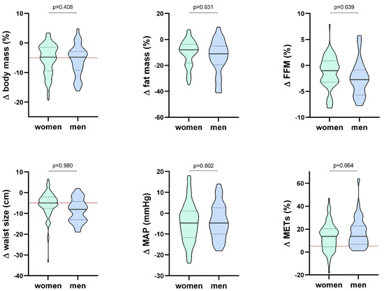 The individual changes in cardiorespiratory fitness (METs), mean arterial blood pressure, body mass, fat mass, waist size, and fat-free mass (adjusted for sex, age, and baseline values) are presented in Figure 1 (violin box).