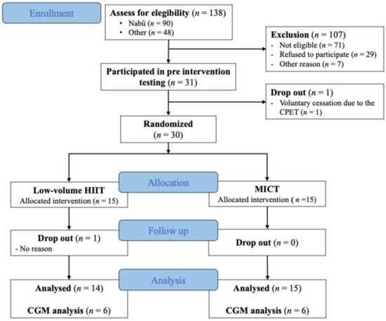Flow chart diagram. Flow diagram of participants through all steps of the study; HIIT= high-intensity interval training; MICT= moderate-intensity continuous training; CGM = Continuous glucose monitoring.
