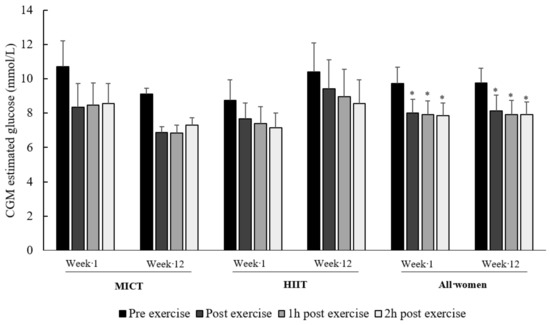 Two-hour effect of exercise on CGM-derived glucose levels. Data are presented as mean ± SEM. HIIT and MICT data are provided to show the absence of difference between groups regarding the acute effect of exercise. Three individuals in the MICT group ate between the 1 h and 2 h post-exercise at week 12. * p < 0.03: significantly different from pre-exercise glucose levels.