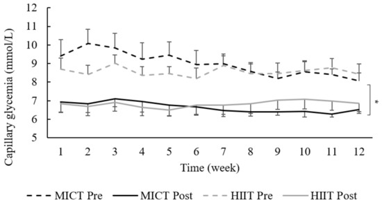 Capillary glucose levels at each week. Data are presented as mean ± SEM; HIIT = high-intensity interval training; MICT = moderate-intensity continuous training; each data point represents the weekly mean capillary glycose of 3 exercise sessions (Monday, Wednesday and Friday). * p = 0.0001: significant acute effect of exercise (pre- vs. post-exercise sessions).