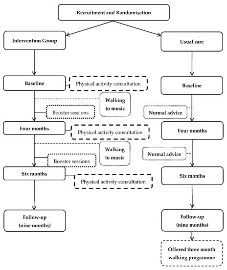 Assessment of RCT outcome measures included a range of clinical, physiological and behaviour change parameters at baseline, four, six and nine (follow-up) months as outlined in Figure 1 (full details of outcome measures are available in a previous publication [5]). At baseline, four- and six-month assessments, the IG participants received physical activity consultations. Between assessment points IG participants received booster sessions via their preferred mode of contact identified during Study Phase Two (Figure 1) [5] and were asked to complete their walking programme to music (an overview of behaviour change techniques and strategies used was previously published [5]). UC participants received no contact between assessments. At the end of the programme the UC participants were offered a three-month walking programme.