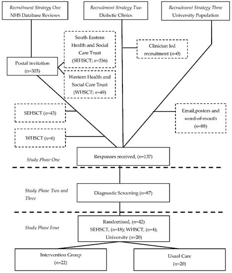 Following patient database searches n = 305 invitation letters (n = 256 SEHSCT, n = 49 WHSCT) were posted to suitable individuals who met the diagnostic criteria (fasting glucose 5.6–6.9 mmol/L−1 and/or two-hour glucose 7.8–11.0 mmol/L−1). Recruitment strategy one (NHS database reviews) resulted in n = 49 (n = 43 SEHSCT, n = 6 WHSCT) individuals expressing interest in taking part in the study. These individuals were invited to take part in Study Phase Two to ensure they met the study inclusion criteria. Overall response rate for recruitment strategy one was 16.1% (16.8% SEHSCT, 12.2% WHSCT). No participants (n = 0; 0%) were recruited from recruitment strategy two (Clinician led diabetic clinics). Recruitment strategy three (University population) generated n = 88 interested responses. Following an initial consultation these individuals (n = 88) were invited to take part in Study Phase Two. Overall, 137 responses were received from recruitment strategy one (n = 49), two (n = 0) and three (n = 88). Recruitment strategy three achieved the greatest response rate (64.2%). Recruitment strategy one accounted for 35.8% of overall responses (31.4% SEHSCT; 4.4% WHSCT) and recruitment strategy two resulted in no responses (0%). Figure 2 provides an overview of the recruitment strategies and randomisation procedures.